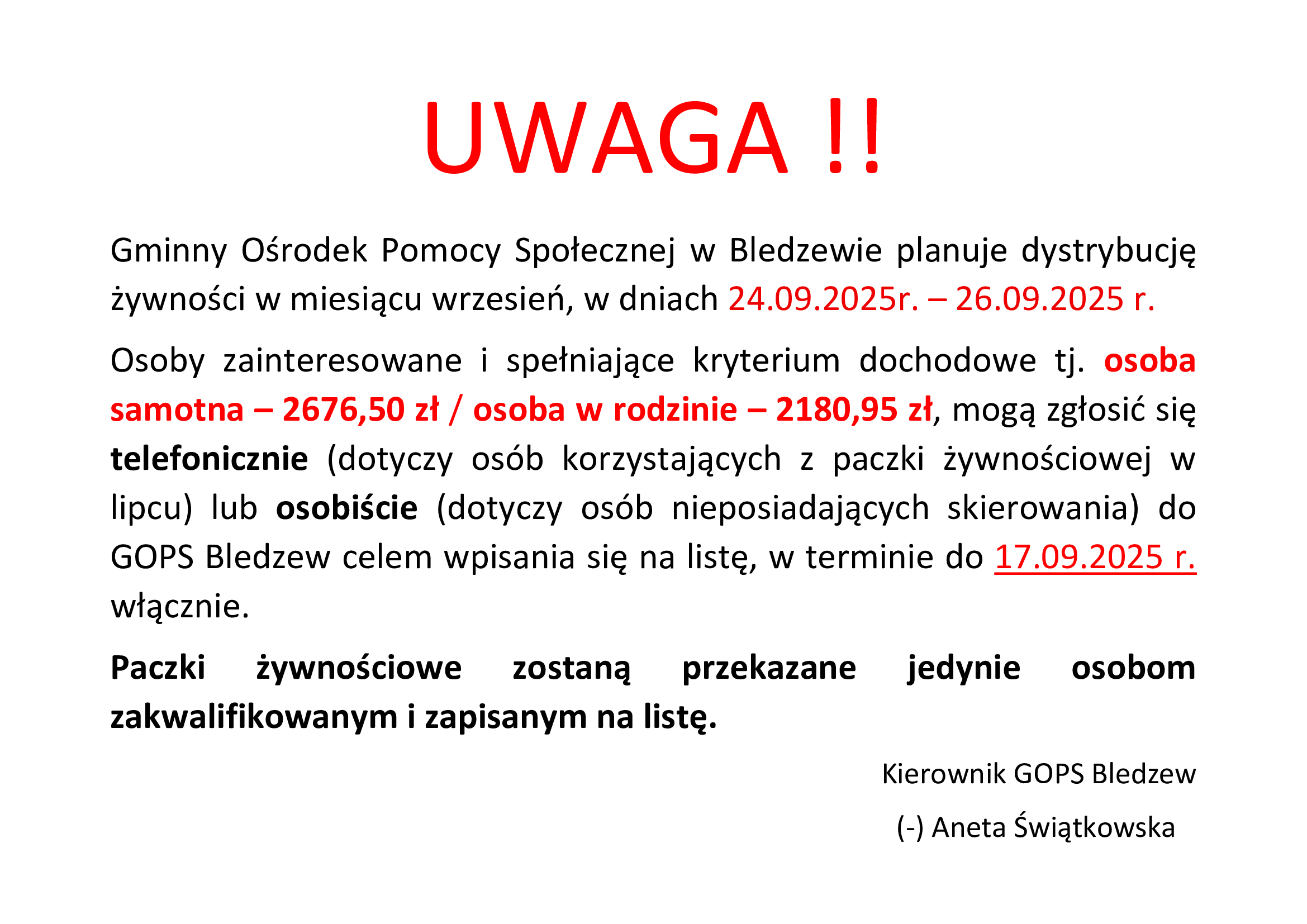 Gminny Ośrodek Pomocy Społecznej w Bledzewie planuje dystrybucję żywności w miesiącu wrzesień, w dniach 24.09.2025r. – 26.09.2025 r.